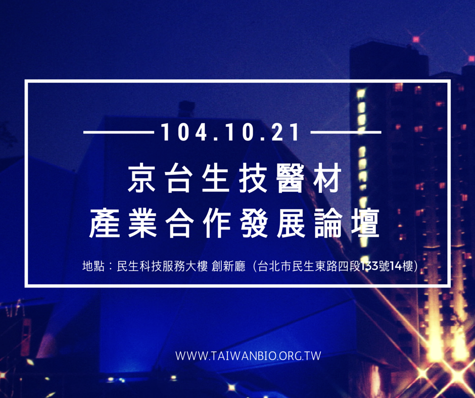 2015-10-21「京台生技論壇」已連續舉辦五屆,今年將於2015年10月21日,兩岸再度攜手合作,將探討「產業發展與兩岸合作前景」、「台灣生技技術、銷售及需求介紹」、 「北京醫藥產業需求與通路」等議題。現場將進行面對面的交流,會中也將邀請兩岸的業者進行分享。內容精彩可期,在此誠摯地邀請您參與「京台生技論壇」親臨指導,歡迎生技業界企業領袖及先進上網報名參加,因場地座位有限,為避免向隅,敬請及早報名!