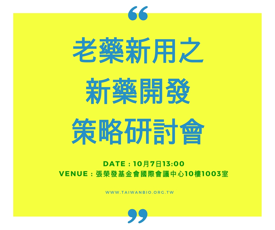 生物產業協會特別於10月7日舉辦『老藥新用之新藥開發策略研討會』,邀請於藥物研發具有獨特策略佈局的健亞生技陳正總經理、從學術研發至藥物成功上市的『青光眼藥物治療之父』 邱春億教授 ,演講老藥新用技術策略與商機;具藥學博士身份的生技產業分析師廖昌亮分享從投資面看產業前景;同時也邀請景凱生技石英珠總經理及陽明大學生藥所 黃奇英 所長擔任與談貴賓,共同探討台灣在此市場之機會,歡迎您把握機會,踴躍參與。因場地座位有限,請您提早報名,以免向隅。