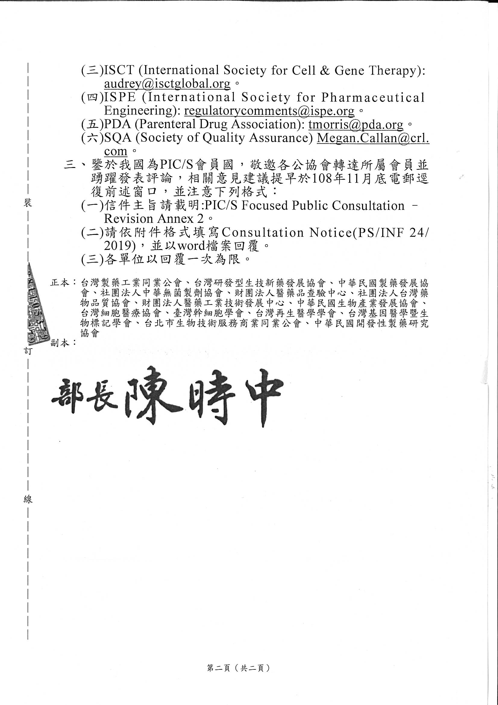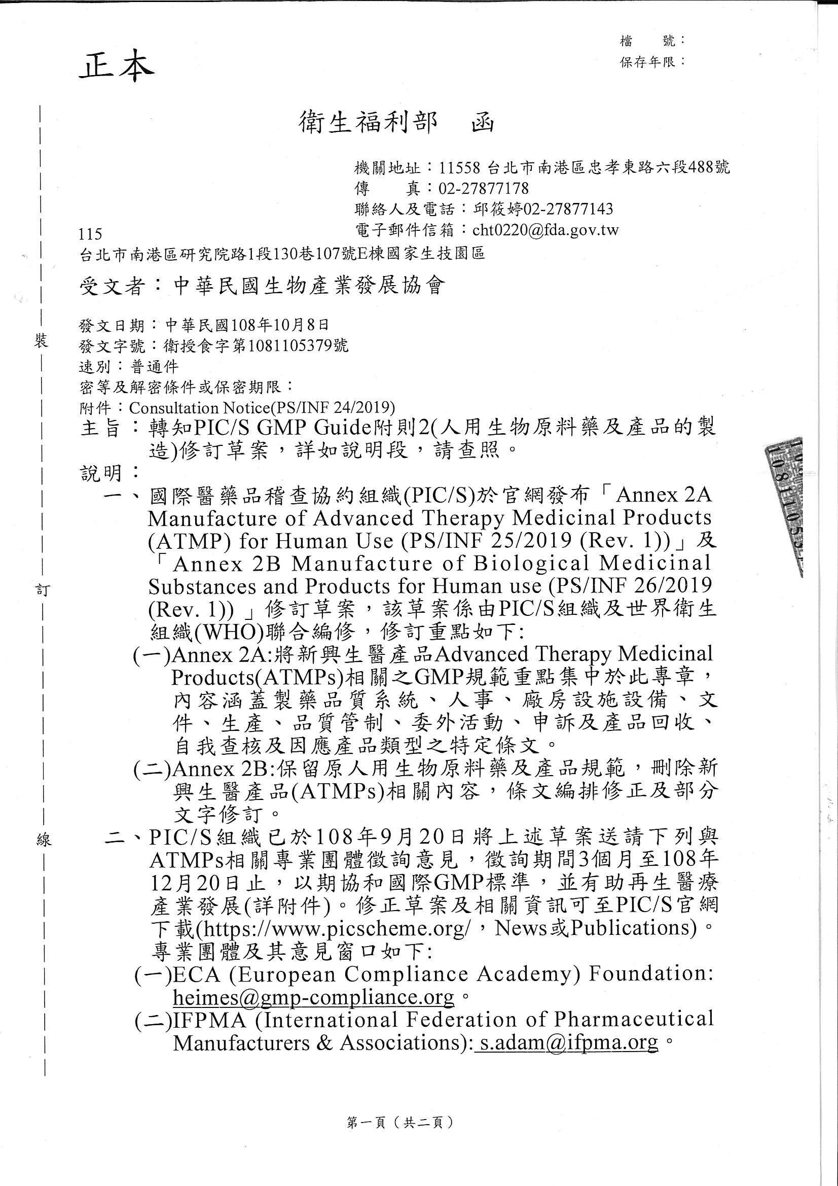 【公文】衛生福利部轉知PIC/S GMP Guide附則2(人用生物原料藥及產品的製造)修訂草案,詳如說明段,請查照。