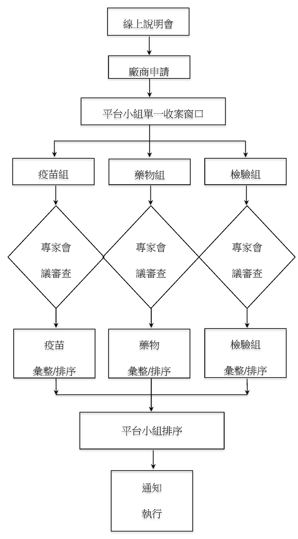 申請案之受理採批次收案批次審查, 簡要流程如下圖所示: