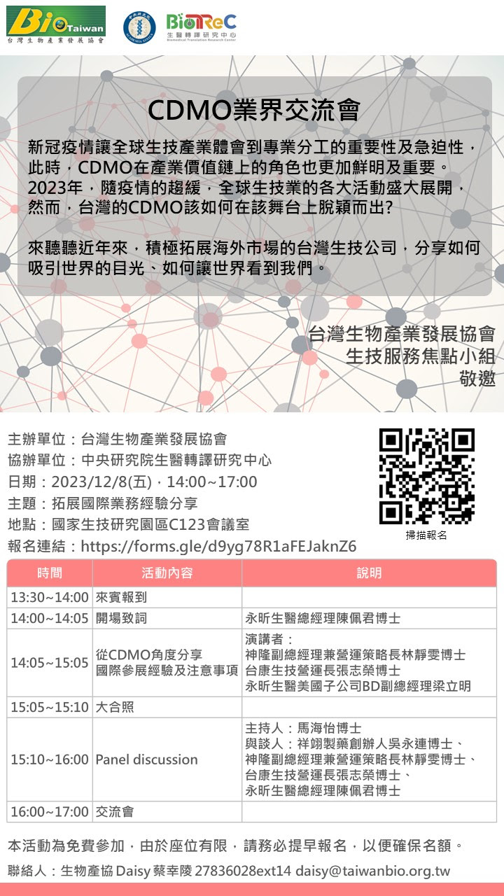 台灣生物產業協會 生技服務焦點小組 將邀請近年來積極拓展海外市場的台灣生技公司