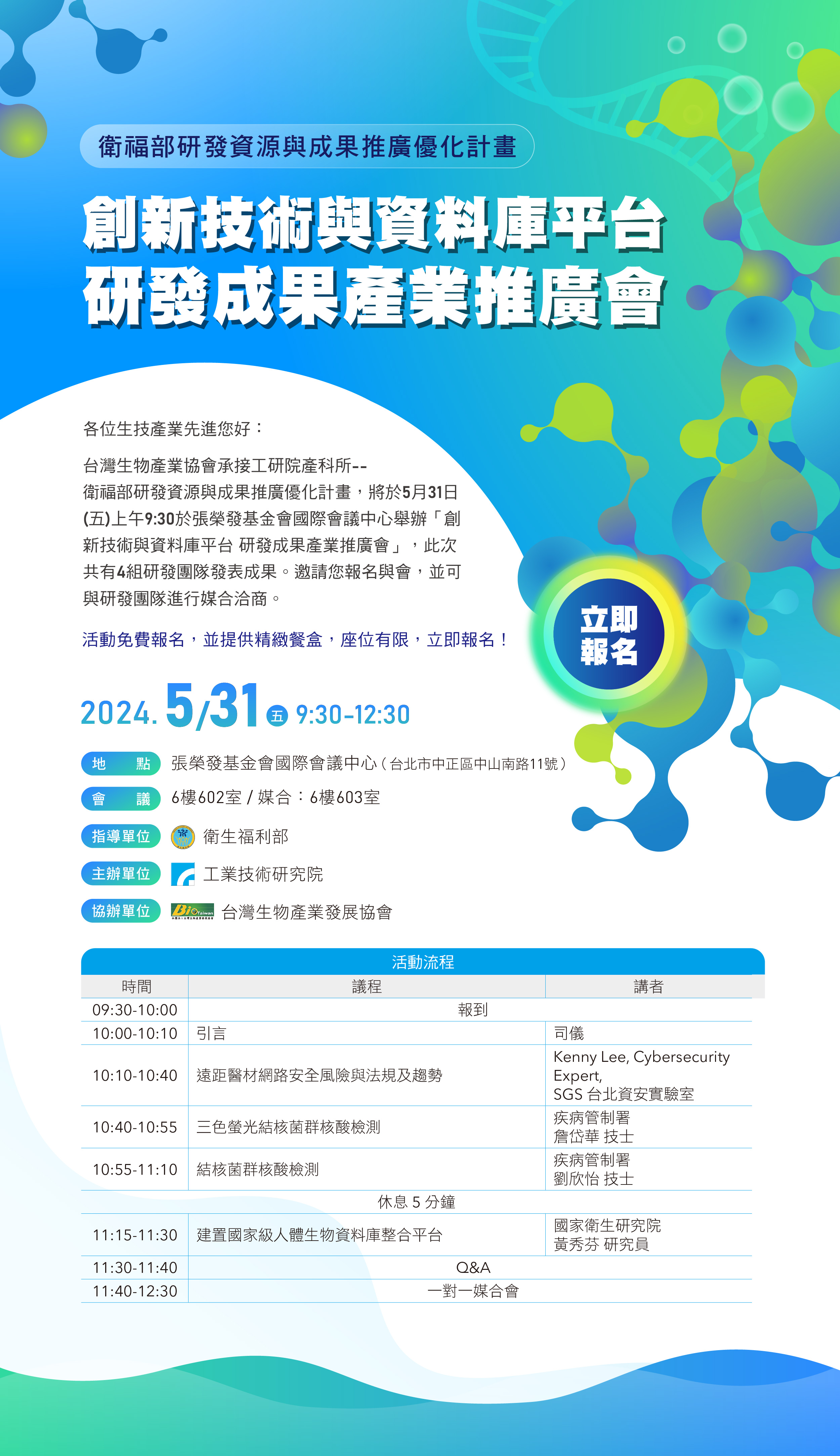 5/31 (五) 9:30 衛福部研發成果產業推廣會,免費參加,歡迎報名~