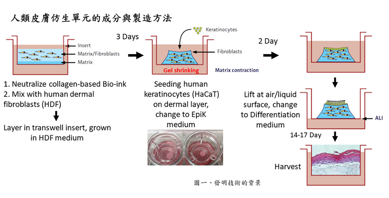 開發目的為製造替代動物實驗的人類皮膚仿生單元,提供一個皮膚刺激性、腐蝕性、光毒性、遺傳毒性,藥物代謝等動物實驗的替代平台。先前製造人類皮膚仿生單元的技術有兩大缺點:(1) 製造真皮層的生物水膠成分,常用化學交聯劑來加強膠原蛋白的組織強度,容易造成細胞毒性。(2)製造表皮層需要使用初代角質細胞,因初代角質細胞比較容易分化成完整表皮層,其缺點為持續繼代不容易,且需要與臨床醫師合作通過研究倫理審查委員會(IRB)審查獲取初代角質細胞,但還是會存在人類檢體個體上的差異。開發此項技術之初,曾參照已發表論文的配方與步驟,都無法做出滿意產品。