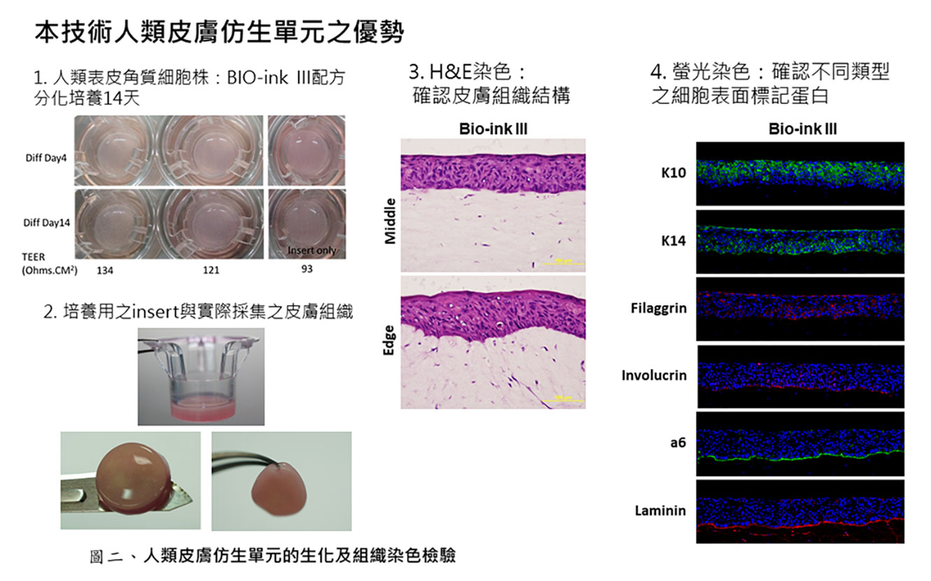 - 人類皮膚包含真皮層與表皮層,此3D皮膚仿生單元與目前市售測試模組只有表皮層不同,多包含了真皮層使更具皮膚仿生性。