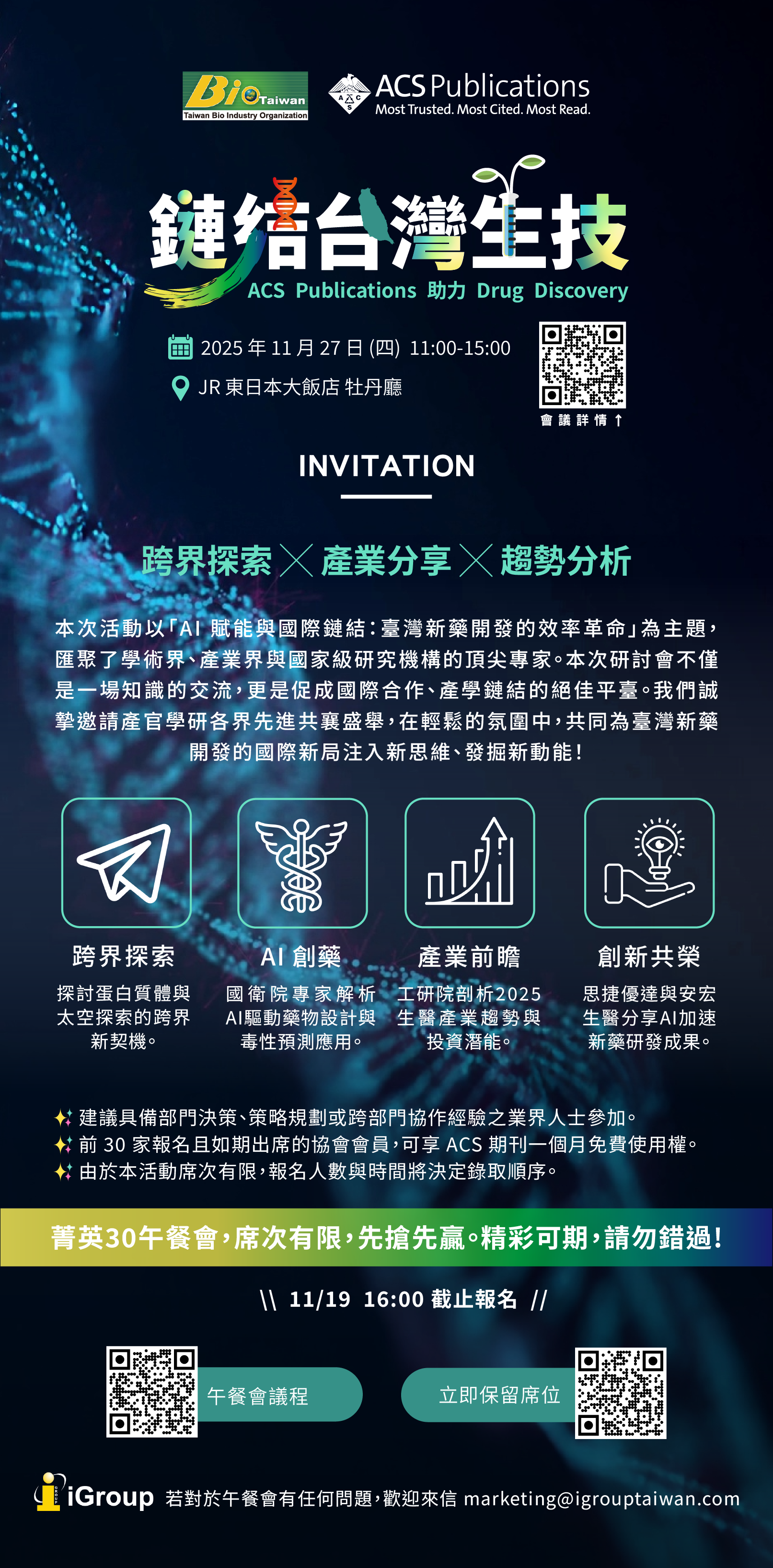 台灣生物產業協會 (Taiwan Bio)x國際化學巨擘 ACS Publications 於 11/27 舉辦:【鏈結台灣生技午餐會】AI 賦能 × 國際鏈結 × 新藥效率革命
