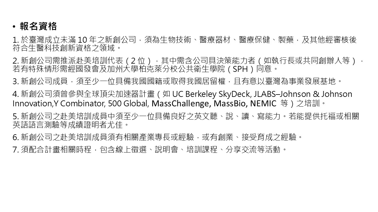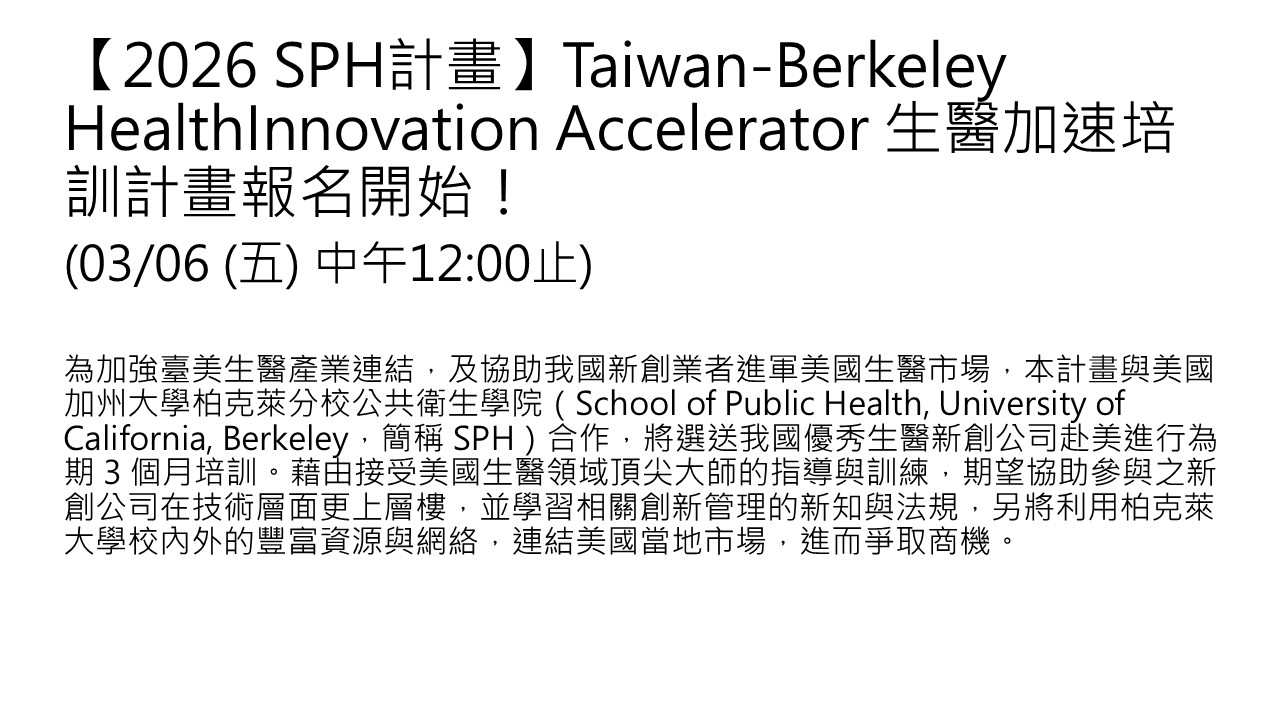 【轉發訊息】臺灣-柏克萊生醫創新加速計畫 『開始徵案』(至03/06 (五) 中午12:00止)
