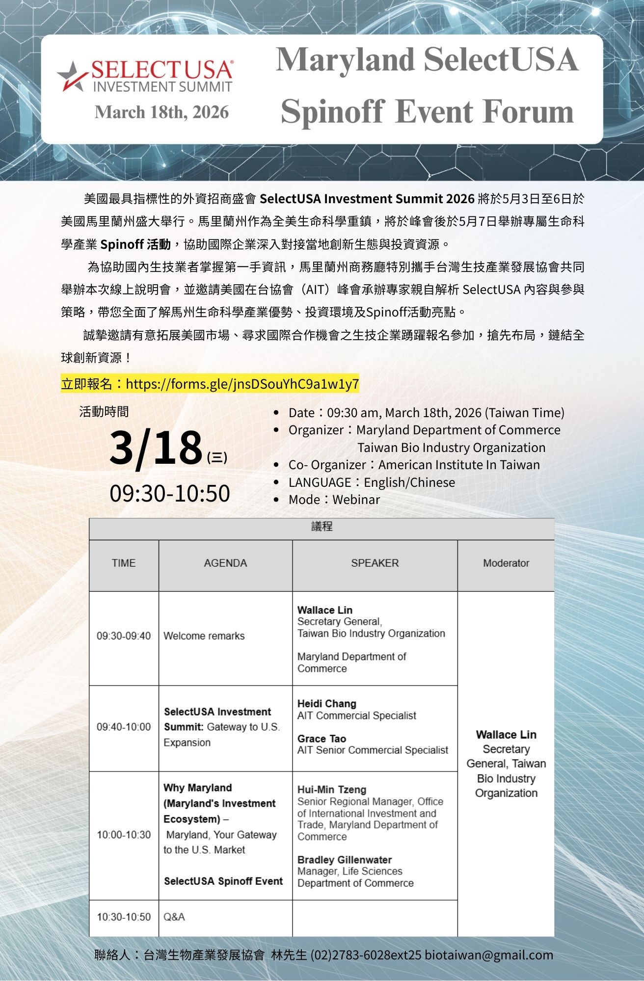 【歡迎報名】3/18 Maryland SelectUSA Spinoff Event Forum 線上說明會