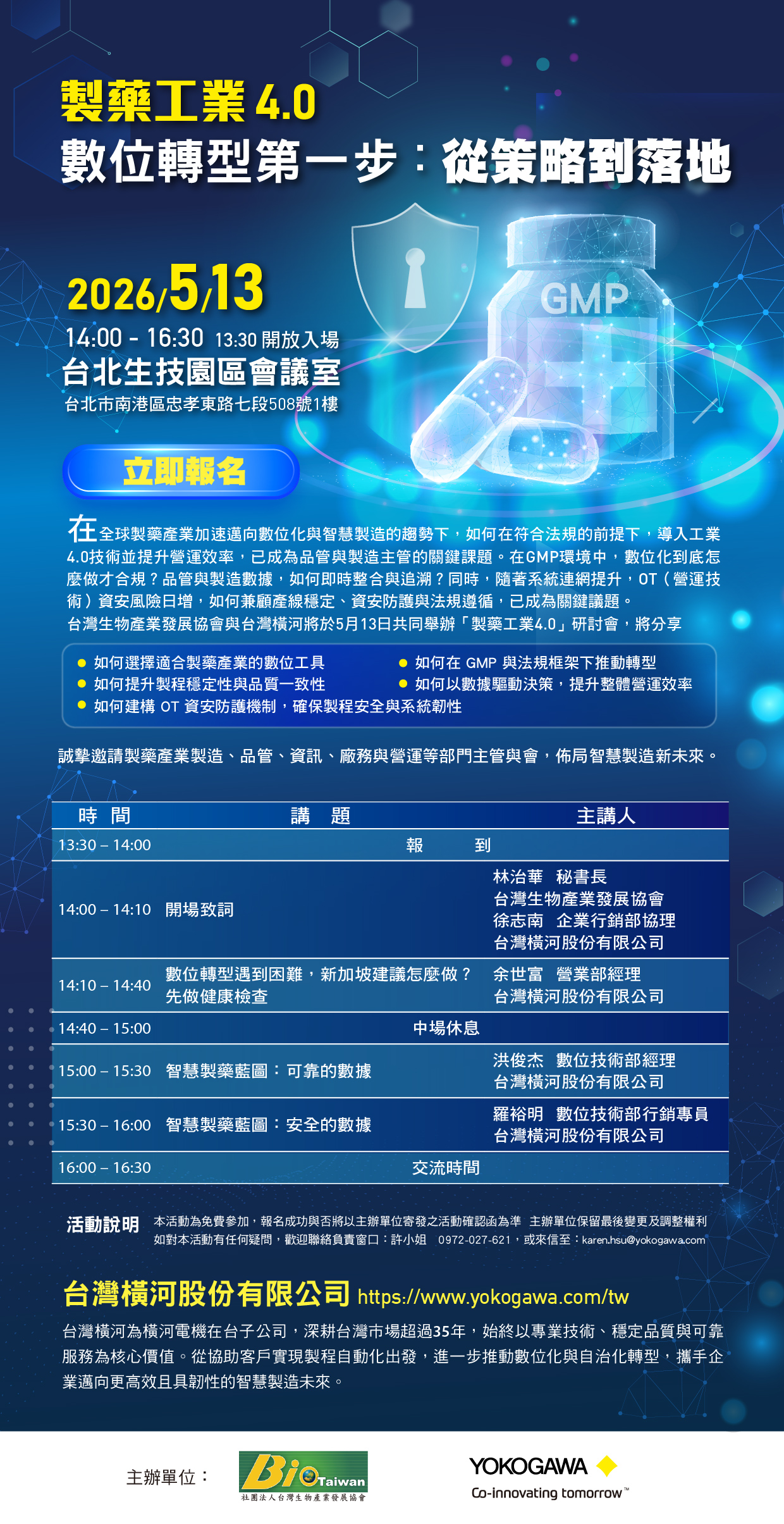 協會與台灣橫河 將於 5/13(三) 下午 14:00 於 台北生技園區一樓會議室 舉辦