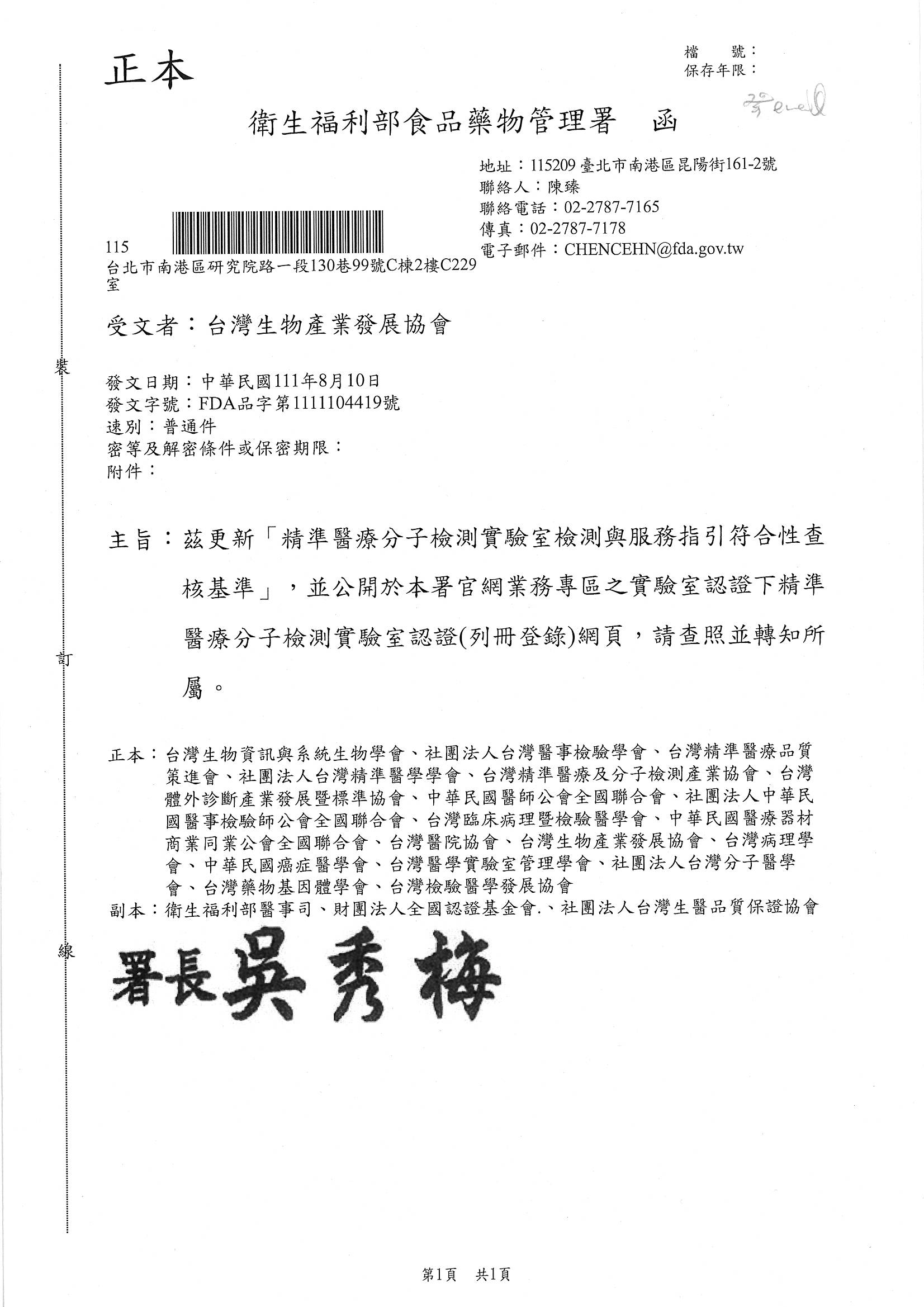 主旨:茲更新「精準醫療分子檢測實驗室檢測與服務指引符合性查核基準」,並公開於本署官網業務專區之實驗室認證下精準醫療分子檢測實驗室認證(列冊登錄)網頁,請查照