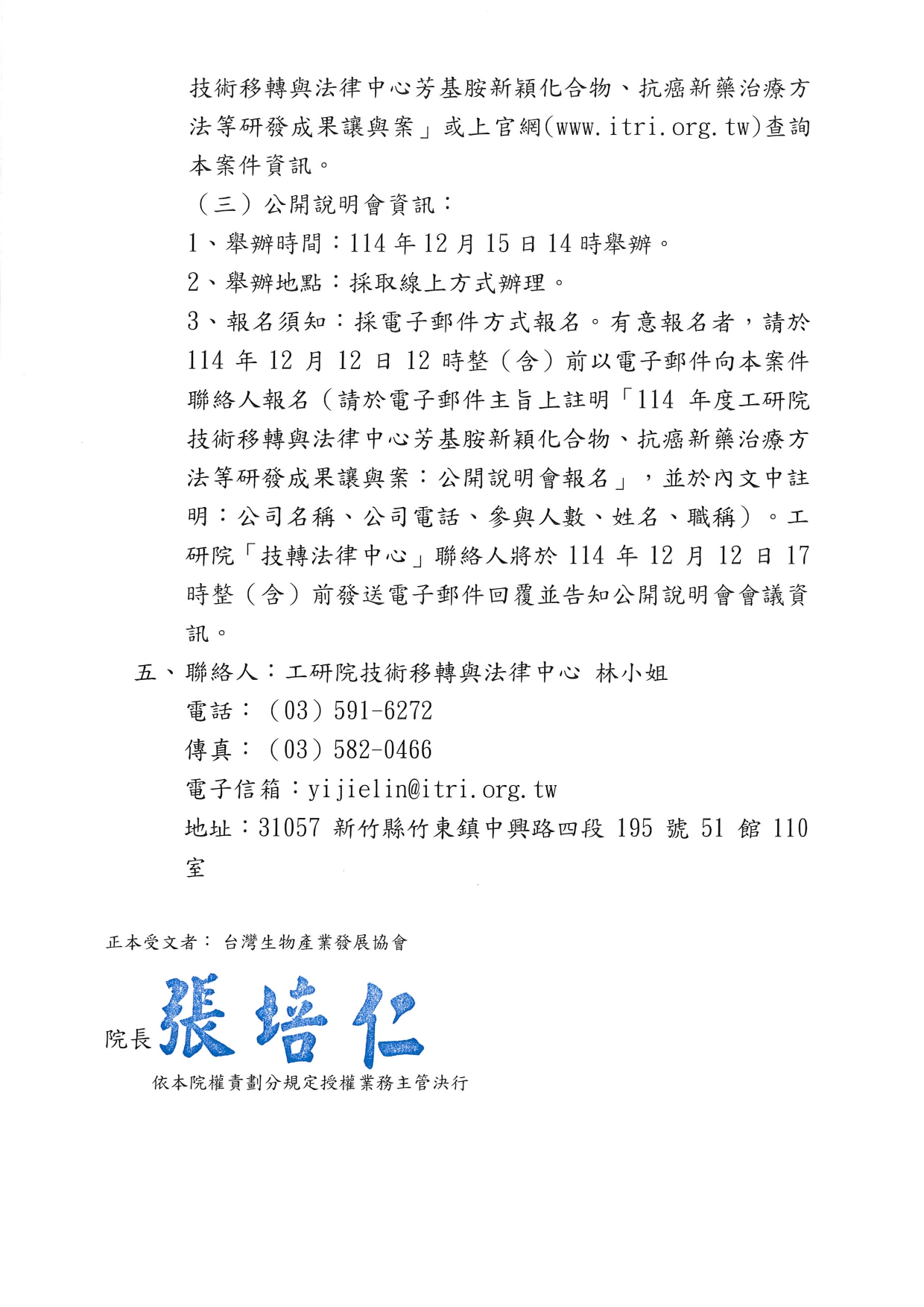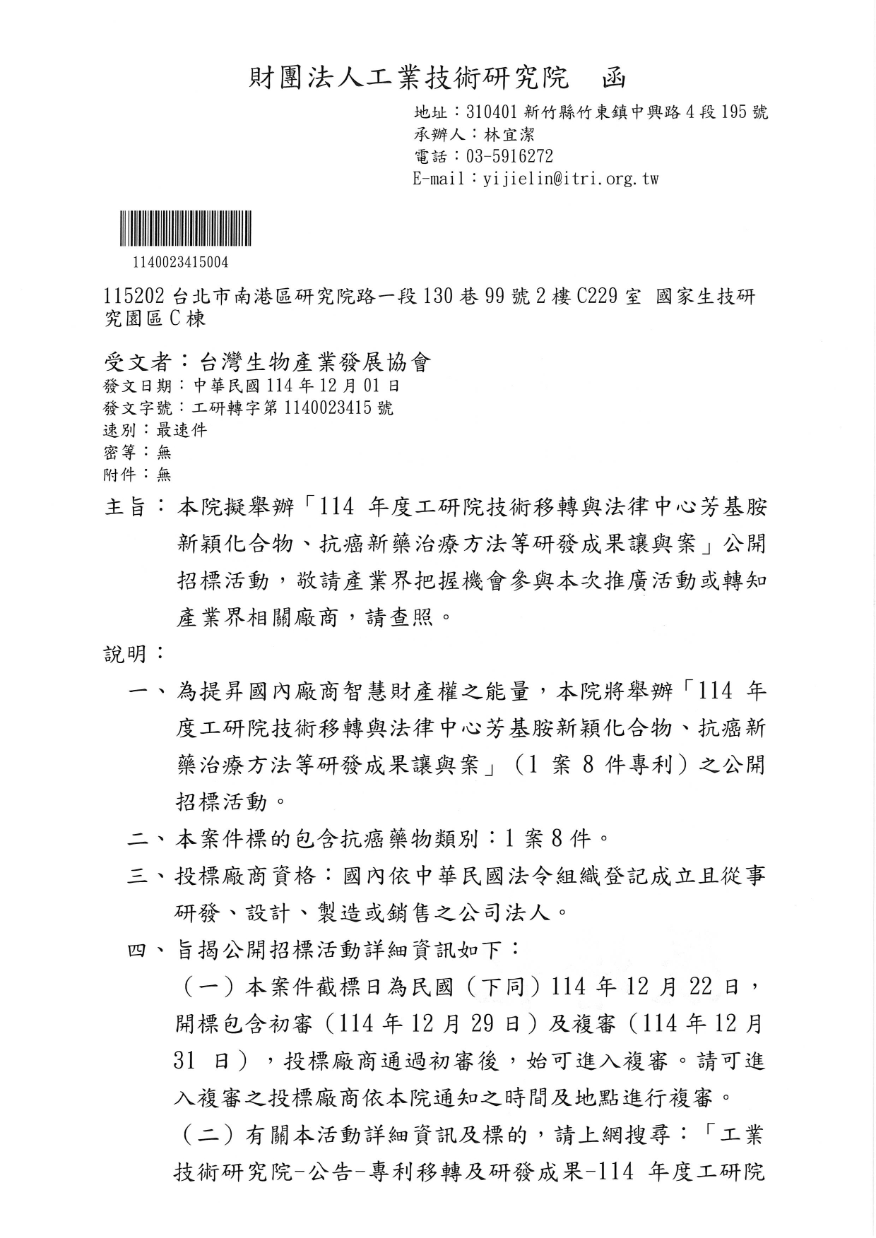 財團法人工業技術研究院 函_舉辦「114年度工研院技術移轉與法律中心芳基胺新穎化合物、抗癌新藥治療方法等研發成果讓與案」