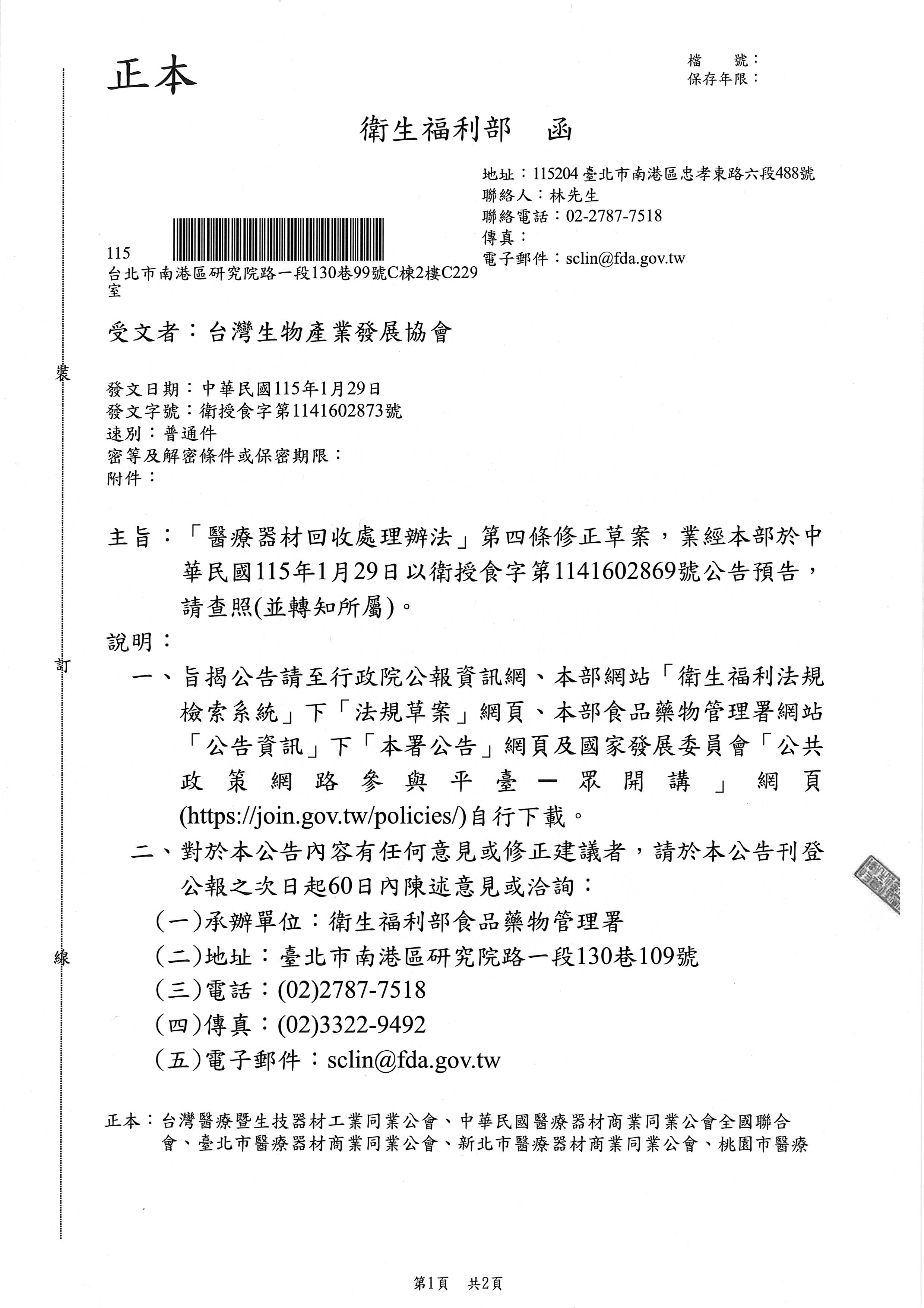 衛福部公函_「醫療器材回收處理辦法」第四條修正草案