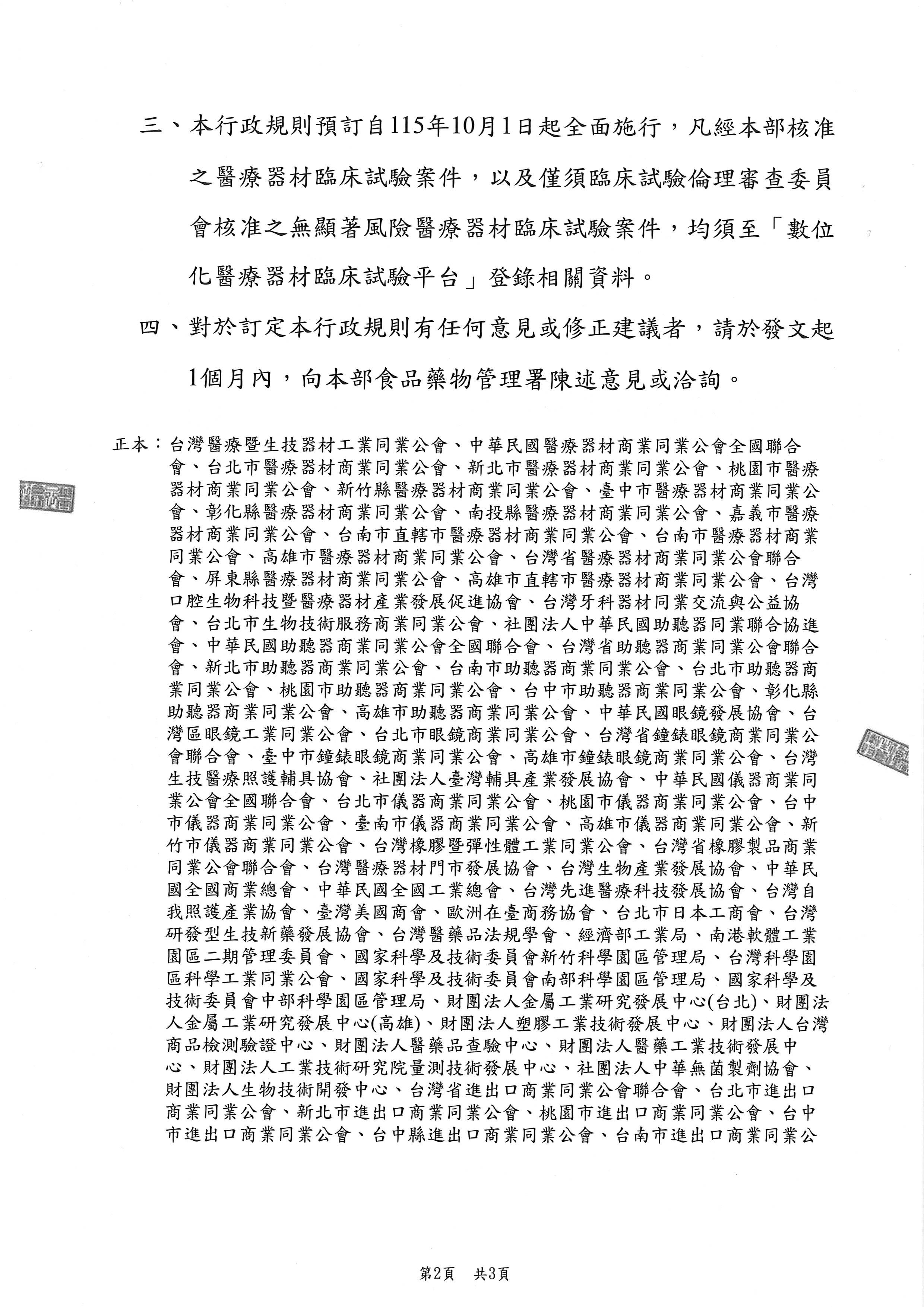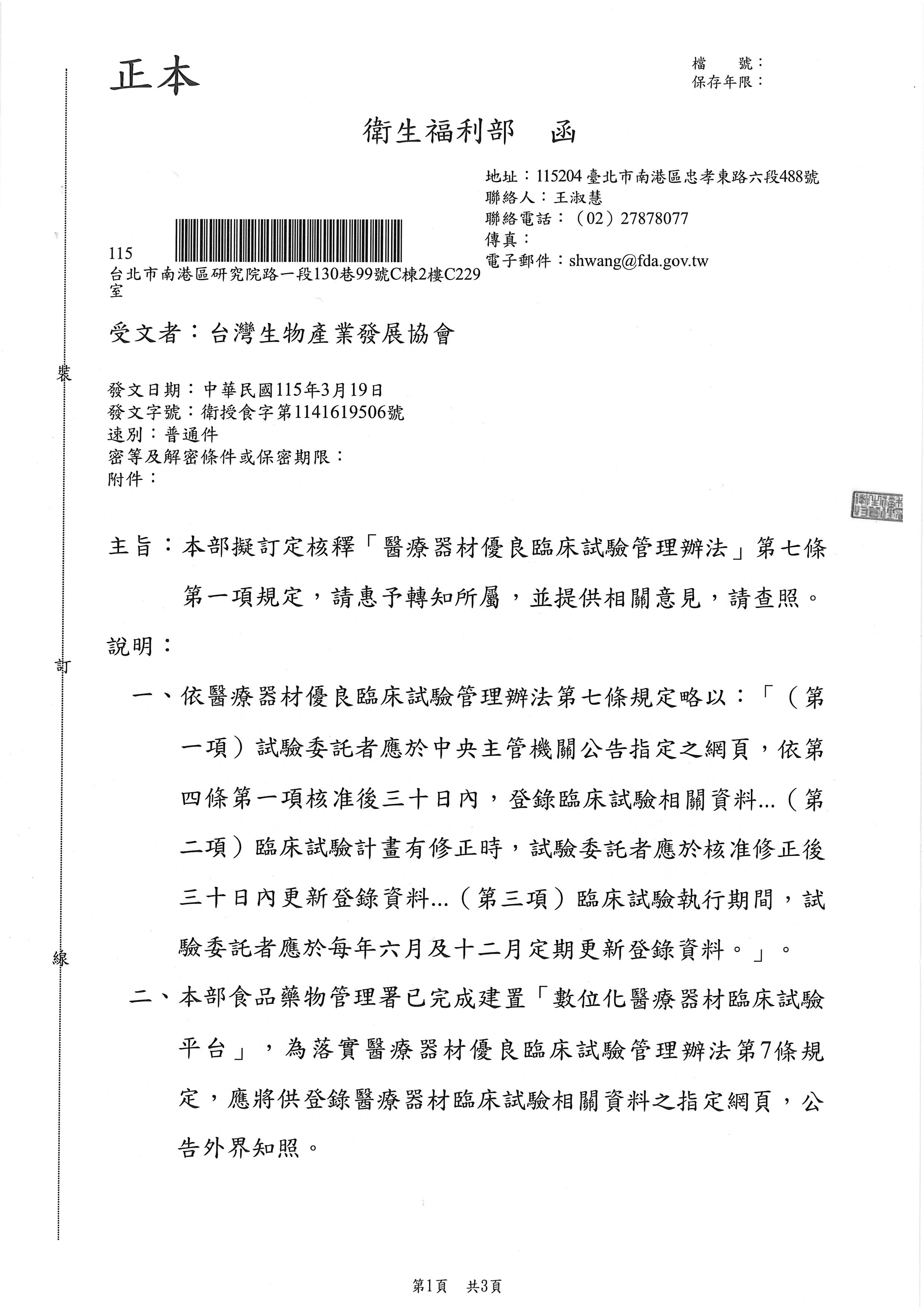 衛福部公函_擬定核釋「醫療器材優良臨床試驗管理辦法」第七條第一項規定,匯集相關意見