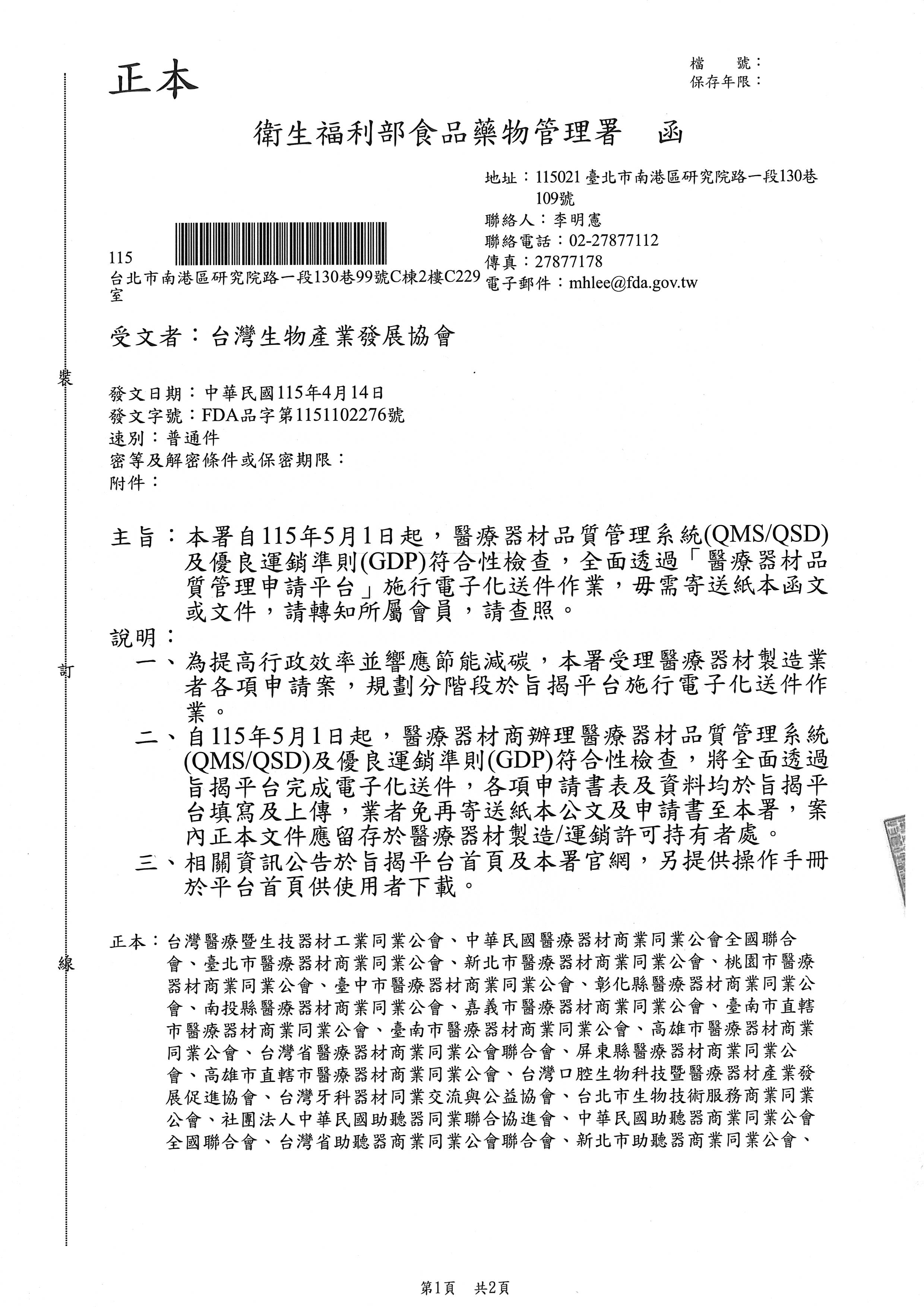 衛福部食藥署公告_自115年5月1日起,醫療器材品質管理系統及優良運銷準則,全面透過「醫療器材品質管理申請平台」電子化作業