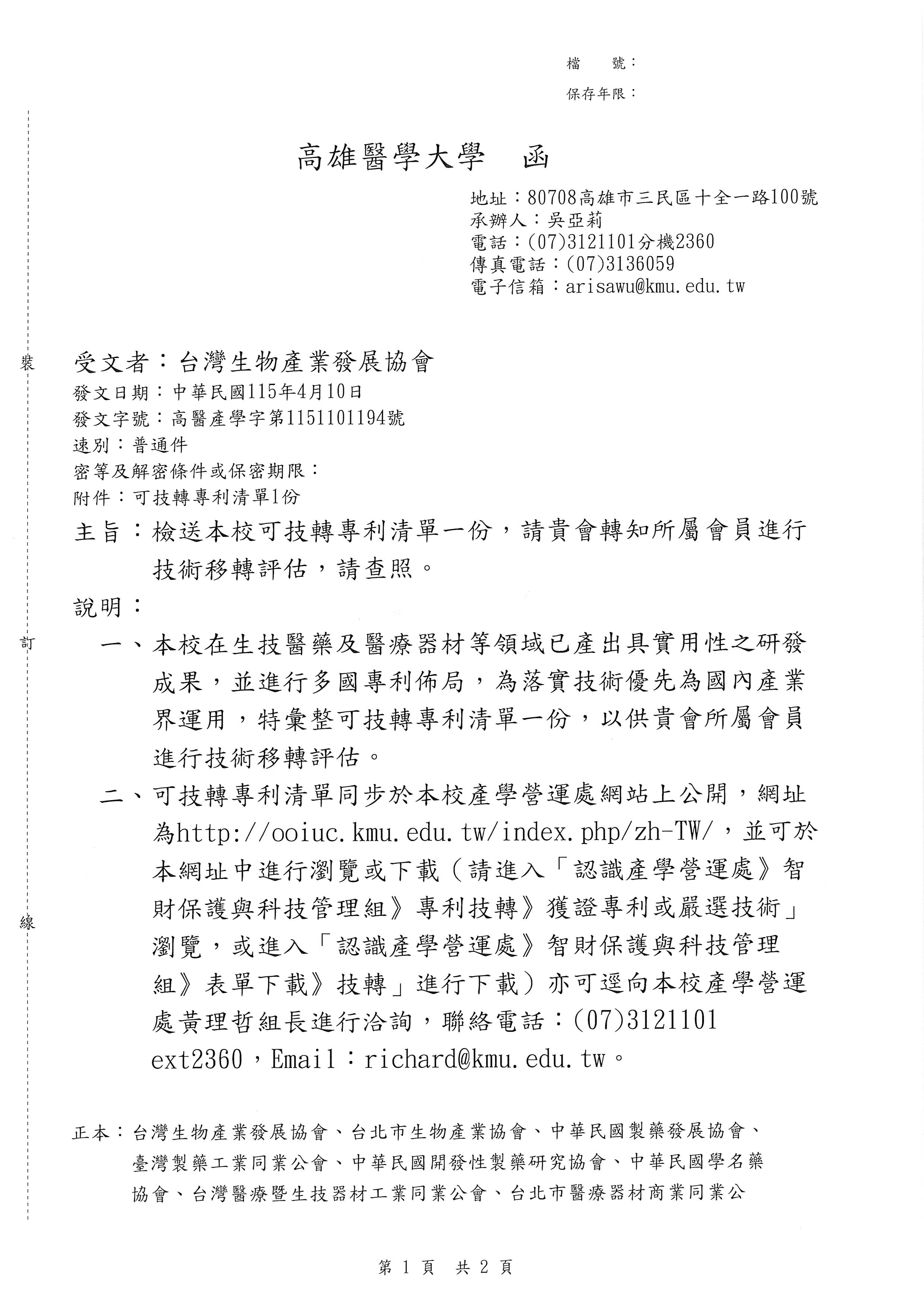高雄醫學大學_檢送本校可技轉專利清單一份,提供技術移轉評估